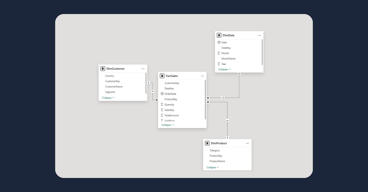 Relationships define how tables talk to each other. They're the bridge between your dimensions (e.g., Customer, Product, Date) and facts (e.g., Sales, Orders). They determine how data is filtered, aggregated, and combined across your model - so getting them right is critical for accuracy and performance.